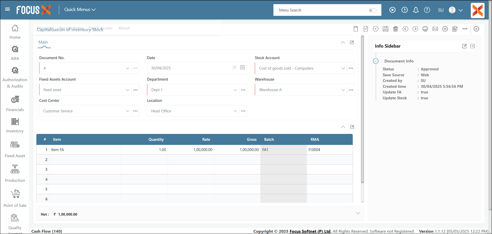 This feature enhances the Capitalization of Asset screen by aligning it more closely with the Fixed Asset Master:
